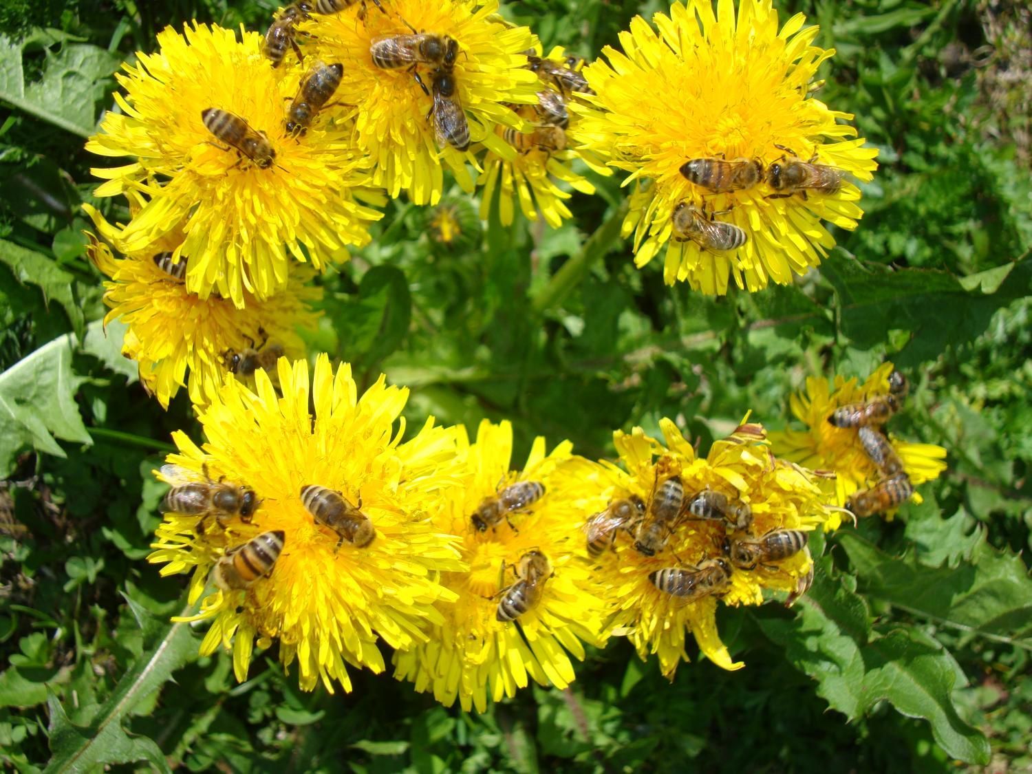 Bienen auf Löfenzahnblüten für Nektar und Pollen sammeln