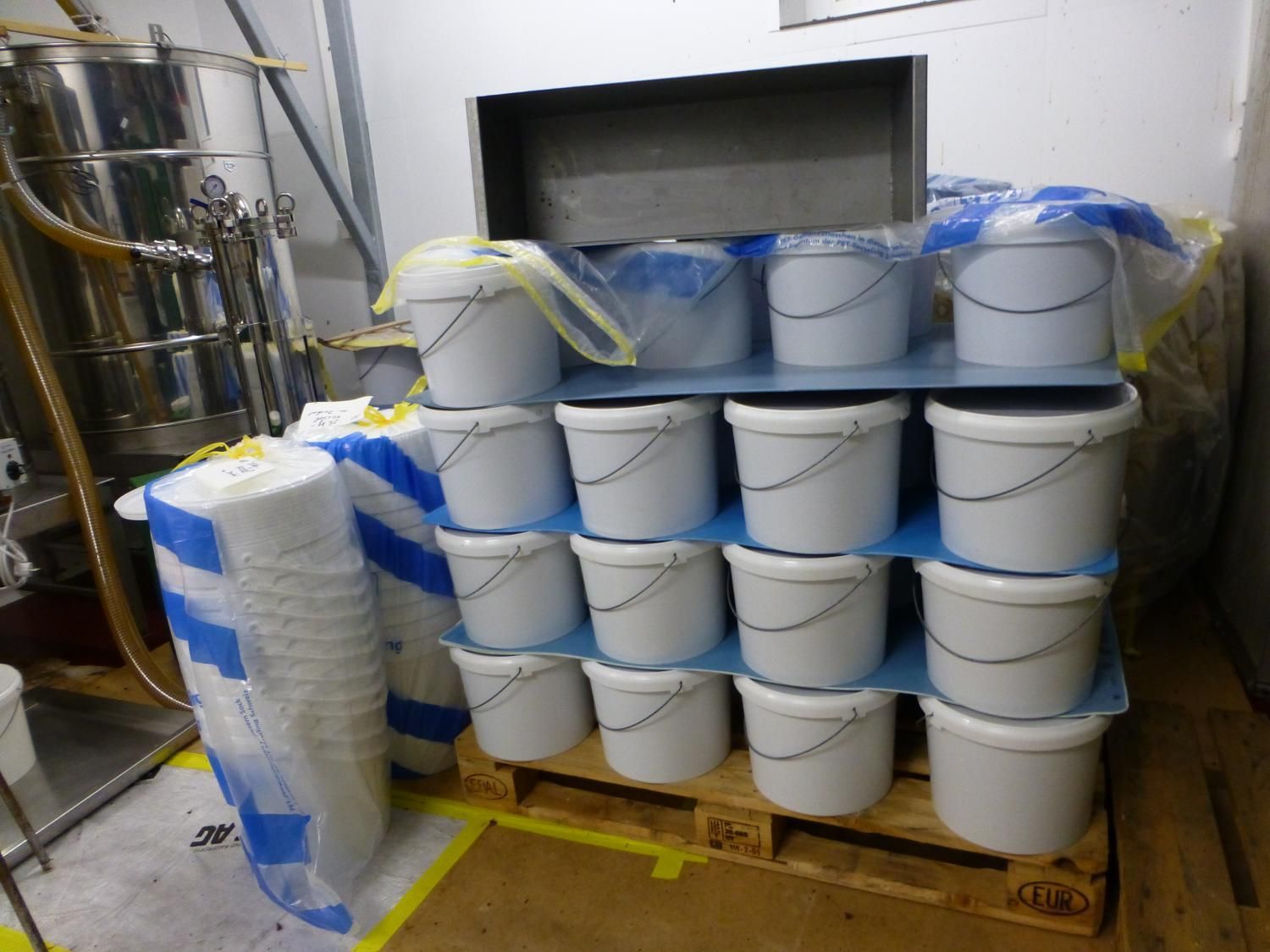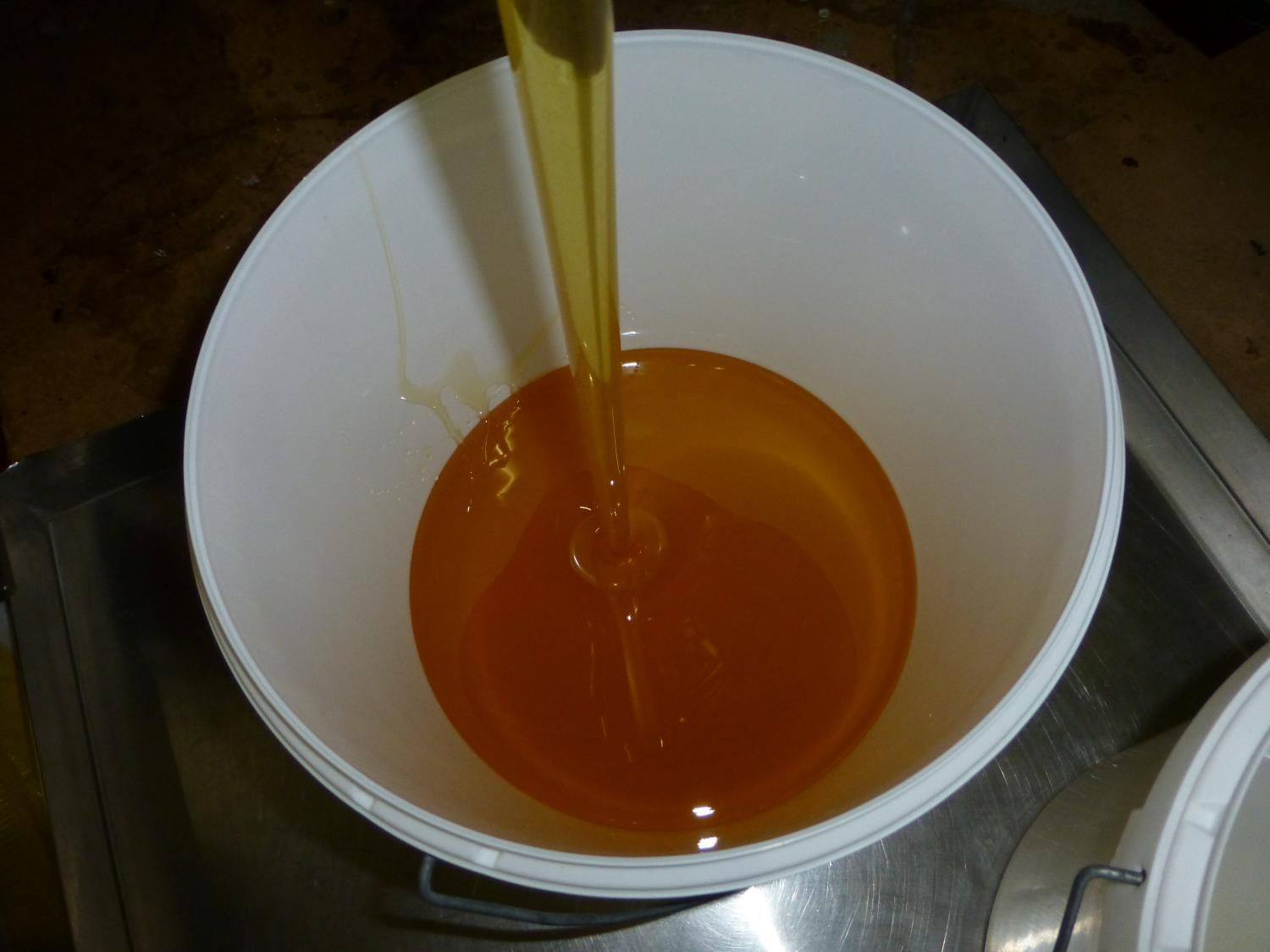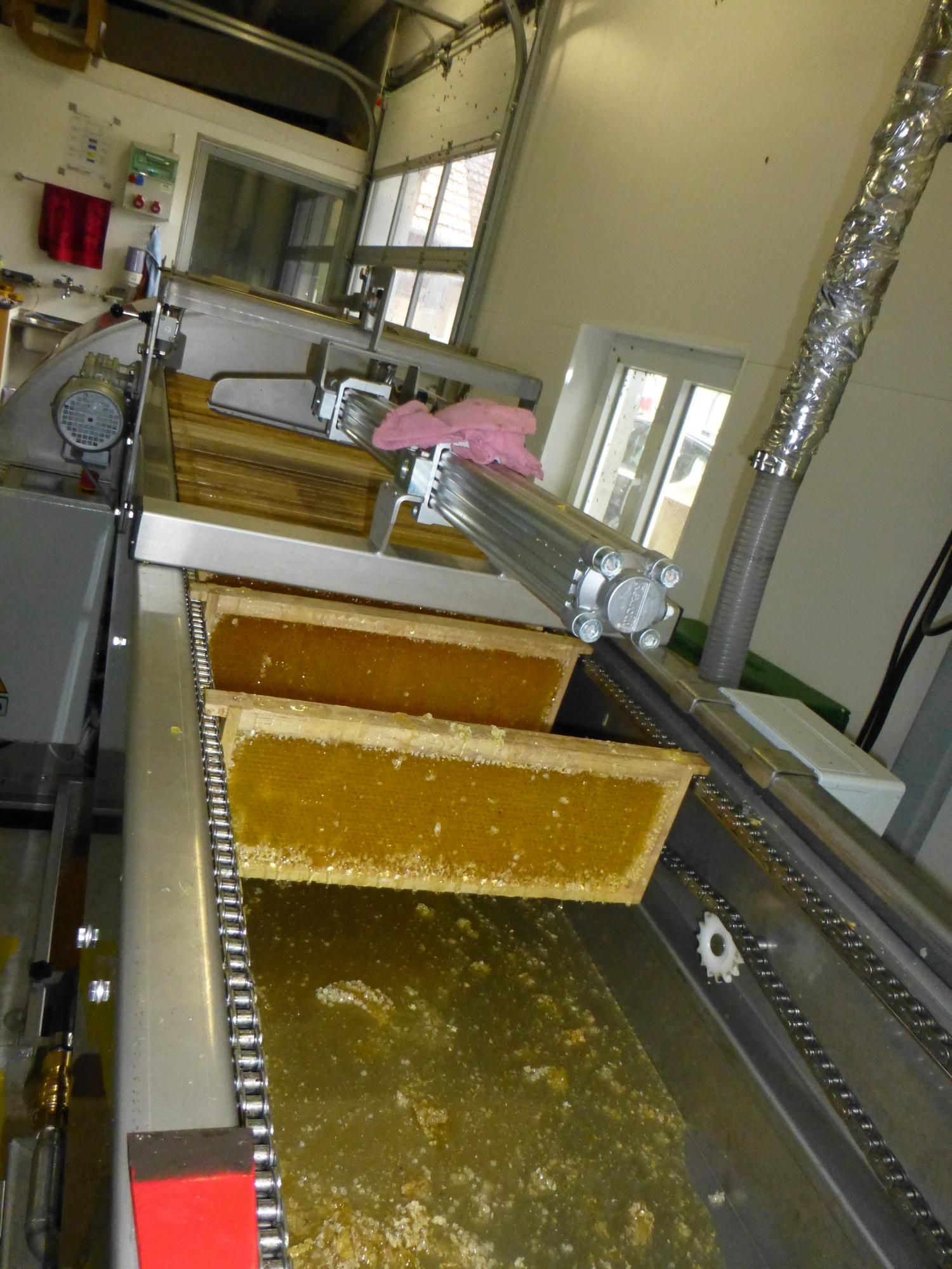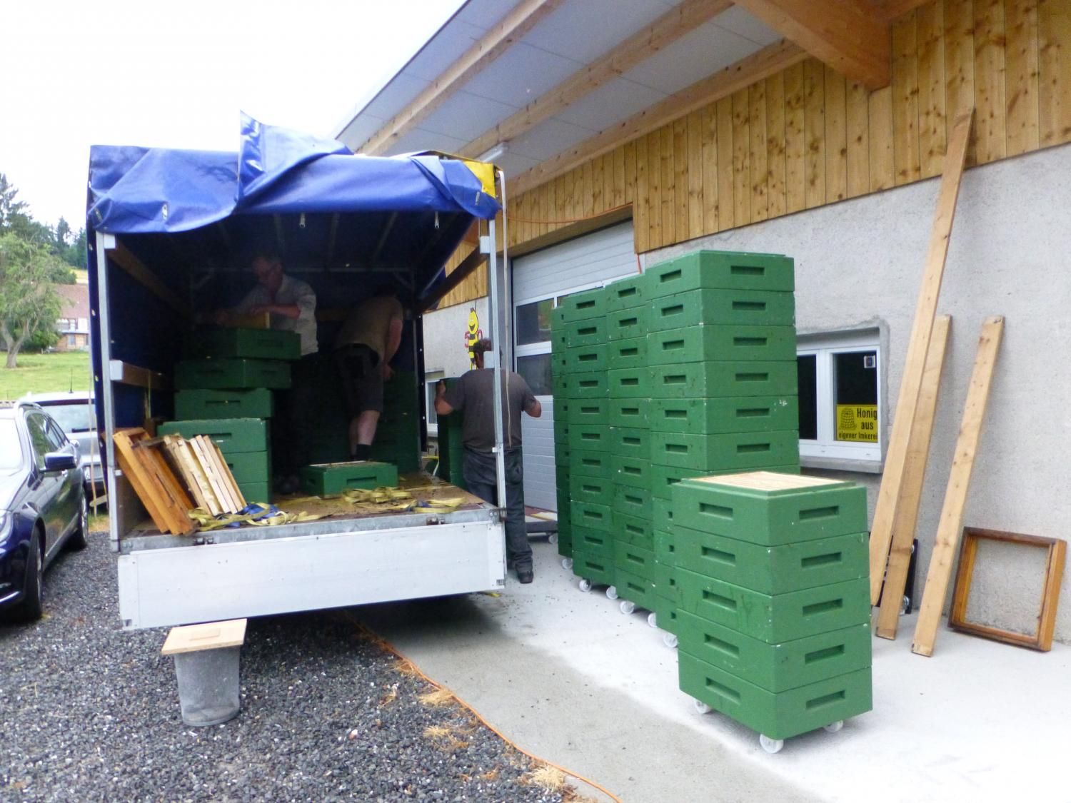 gefüllte Honigzargen werden im Honighaus abgeladen